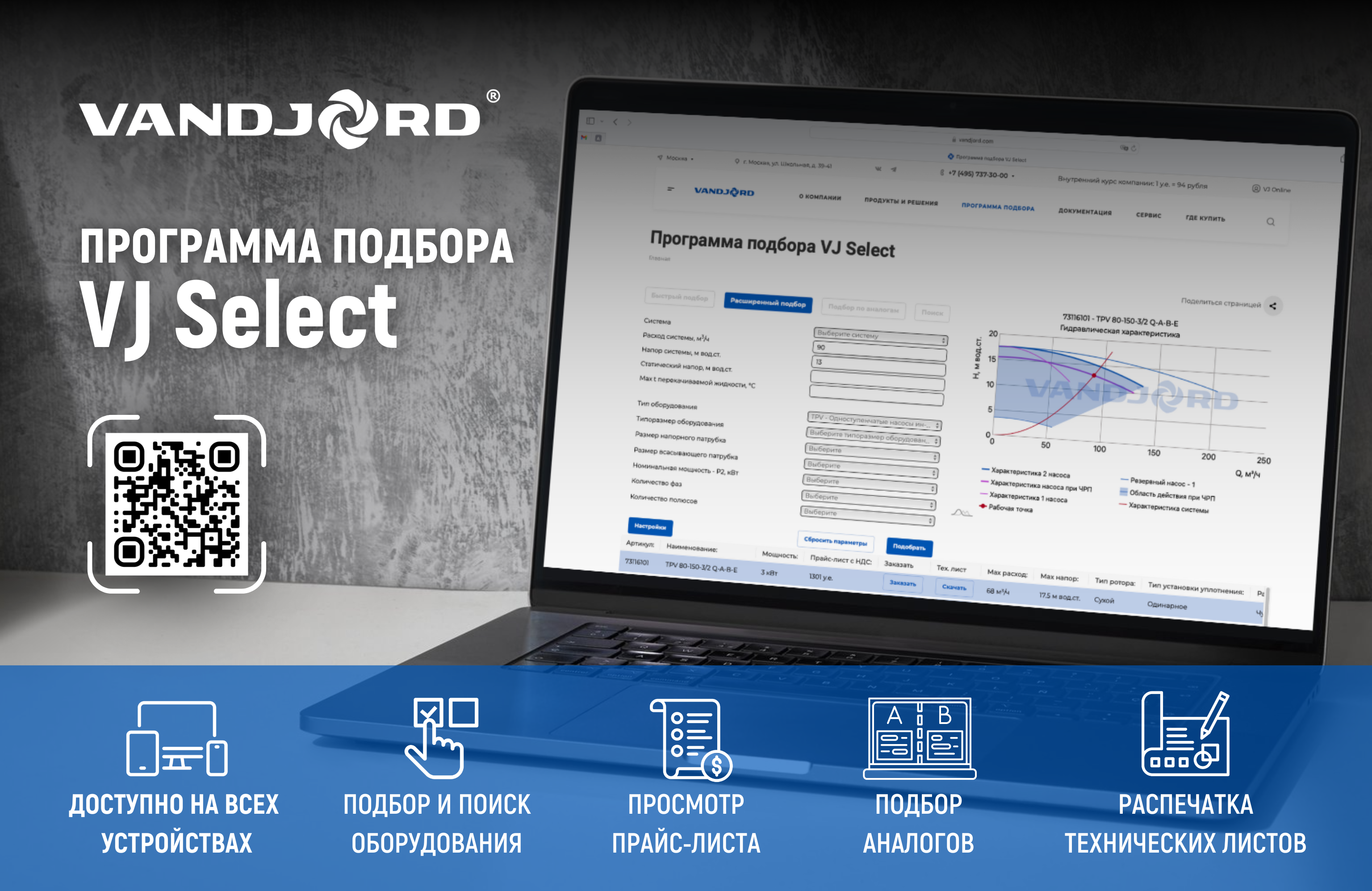 我们的产品选择程序 VJ Select.是您选择泵时的可靠助手。轻松启动 - 输入系统的流量和压力,选择系统和/或泵的类型,单击“选择”按钮 - 您的要求将立即得到考虑。当需要考虑的参数较多时,那么不用担心,这在我们的中也是可以的